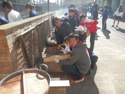 女子が調理をする一方で男子はかまどを担当しています。