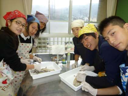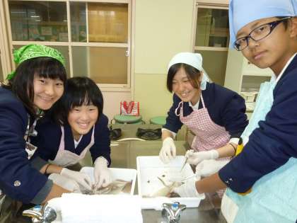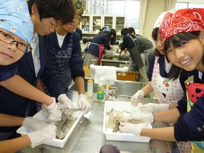 3限に2年1組は調理室にて,理科の授業でいかの解剖をしていました。