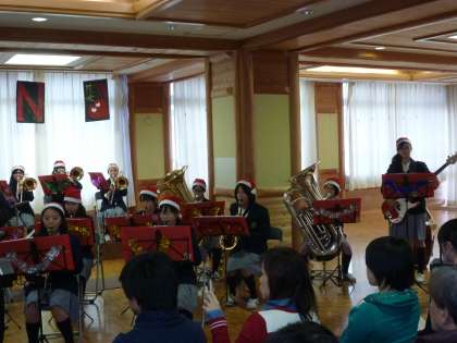 本日(21日),13:00より多目的室にて吹奏楽部によるクリスマスコンサートが行われました。1曲目は「Carol Swingin コレクション」で,クリスマスらしい楽曲からです。