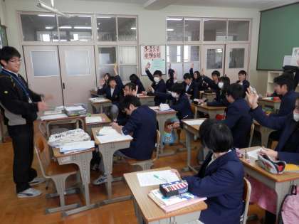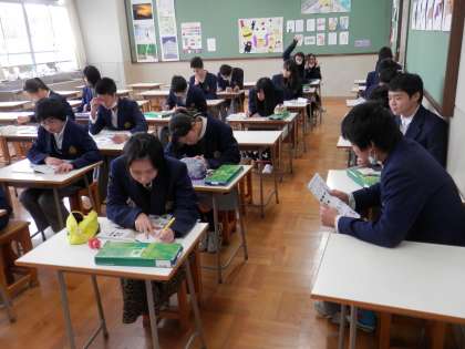 家庭科ではカカオ農園で働く現地の子どもの様子をDVDで見ていました。国語の時間には、日頃、日本語をどの程度大切にしているかについての意識調査をしていました。