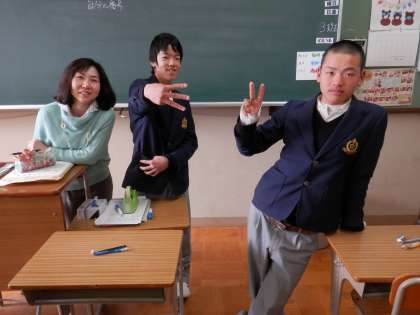ここでも、先生が教室で生徒と休憩時間を過ごしています。