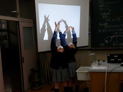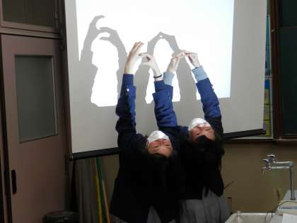 授業後、2年生女子が2人入ってきてスクリーンで影絵をしていました。