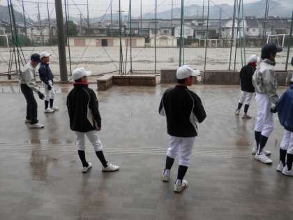 野球部は、雨にもかかわらず、地域の小学生や他校の中学生を招いて合同練習を行っています。