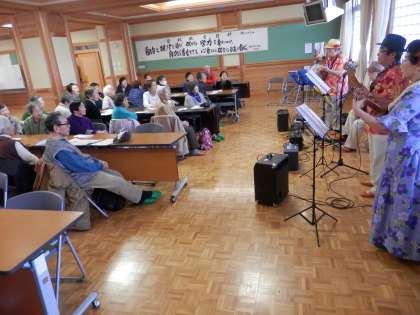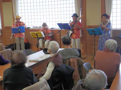 今日の社会福祉協議会主催の「健康すこやか学級」へは、高齢者の方のバンドが登場しました。
