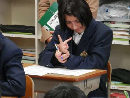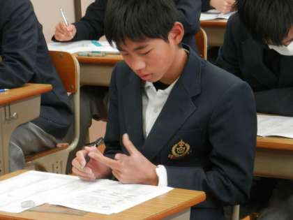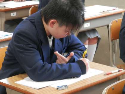 テスト問題をにらみながら、盛んに左手で検証しています。