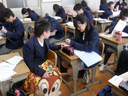 英語の時間には、各自が問題に取り組む中で先生が質問に答えていました。