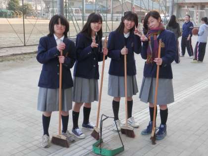 当番で玄関付近の清掃活動をしてくれている吹奏楽部の人のショットと一緒にどうぞ。