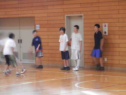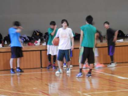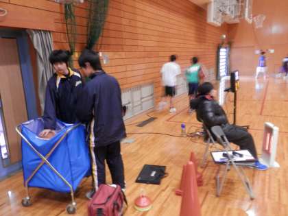 体育館では男子バスケットボール部が活動中です。