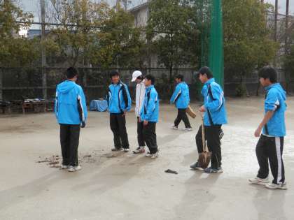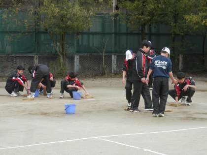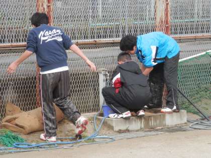テニスコートでは、男子が一生懸命に水取りをしています。