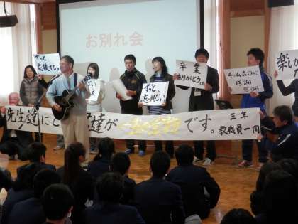これまで見たことのなかった企画は、学年担当の先生方に学級の代表生徒から「感謝状」を贈るというものです。また、その感謝状の内容(文章)がよくできています。先ほど「誰が考えたのか?」と学年の先生に尋ねましたが、「生徒の誰か」としか分からないらしいです。3年生ともなれば、教師の動きを実によく見ているものです。また、教師の意図することを見事に理解もしています。感謝状を贈呈する生徒の人選も文句のつけようがありません。教師はこういうシテゥエ—ションに極めて弱いものです。涙を見せる教師が多くいました。大いに結構です。生徒の前で泣いてもいいじゃないですか。却って人間らしくてよいと思います。この子たちの前だからこそ飾る必要がないということの証明でもあります。かつて、一緒に勤務したことのある若い教師が次のように言ったことを思い出しました。