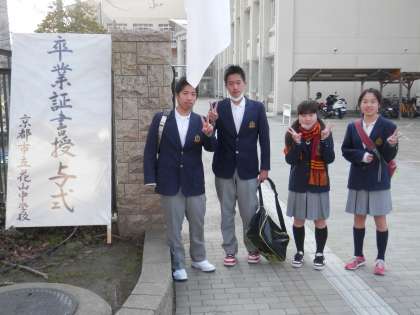 最後の登校をする3年生を校門で待ちました。早く来た人から写真に収めました。