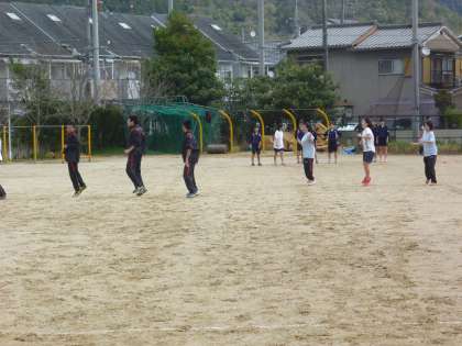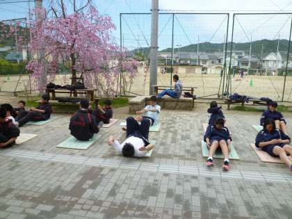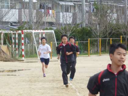 勧修寺グランドから学校へ帰ってきましたら,陸上部が練習をしていました。長距離と短距離に分かれて練習をした後,フィジカルトレーニングを行っています。日頃の地道な努力が0.1秒に凝縮されます。がんばれ。