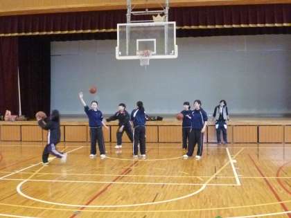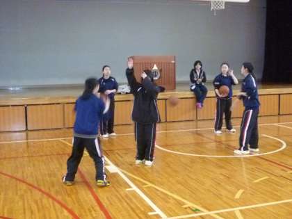 女子バスケットボールも男子の横のコートでシュート練習をしています。シュートはどれだけ多くの数を打つかで率がかわりますので,しっかり打ち込んでください。