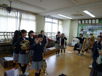 朝練習のはじまる直前にお邪魔しました。いつも吹奏楽部は元気です。