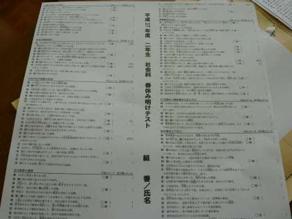2年生は,早速,春休み明けの課題テストにとりくんでいます。この時間は社会科です。