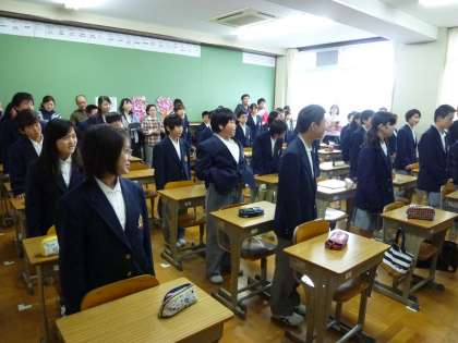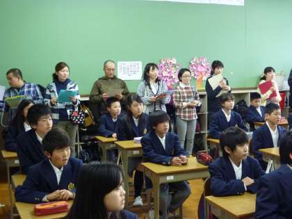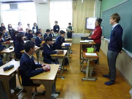 本日6限,1−2にて英語の公開授業が行われました。公開の対象は鏡山小学校の20名の先生方です。