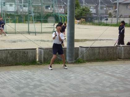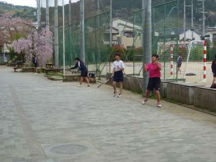 昨日の雨の影響でグランド状態が悪いためソフトテニス女子が校舎前で練習をしています。