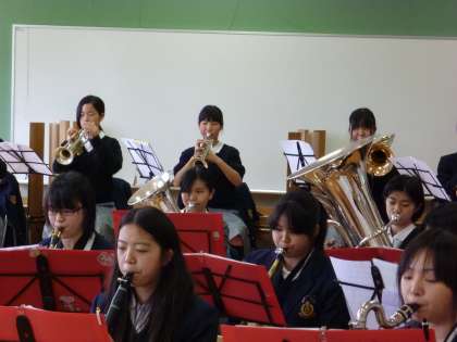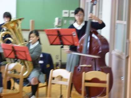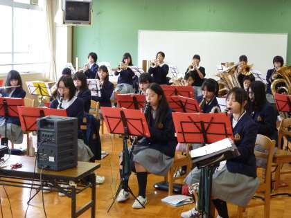 吹奏楽部はランチルームで合奏の練習中です。