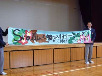 明日からの修学旅行に向けて5限に体育館にて3年生修学旅行団の結団式が行われました。まずは,団旗のお披露目です。