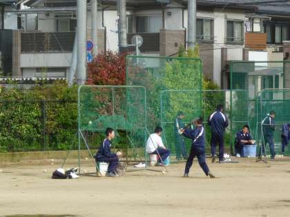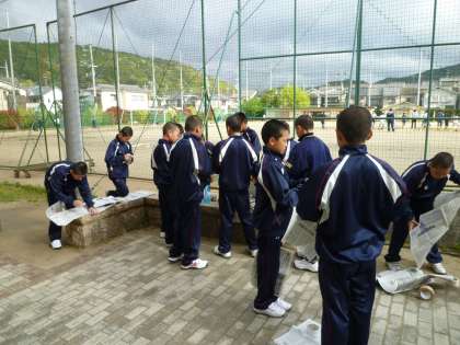 野球部は1年生が,お手製の新聞紙を丸めたボールつくりに励んでいます。