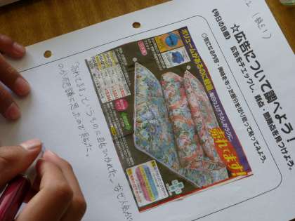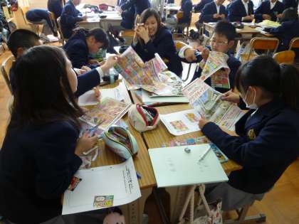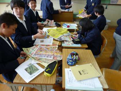家庭科の授業で,実際の広告を使って広告の特徴を学んでいます