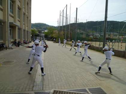 野球部では1年生が声にあわせて素振りをしています。