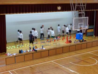 男子バスケットの1年生はステージで別メニューを行っています。