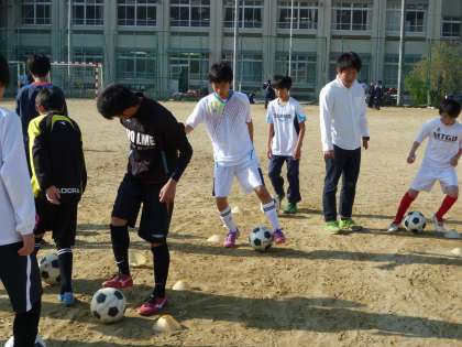 今日の朝練では,せまい範囲でのドリブルを練習していました。たぶん,ボール扱いの基本トレーニングなのだと思います。