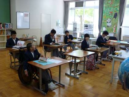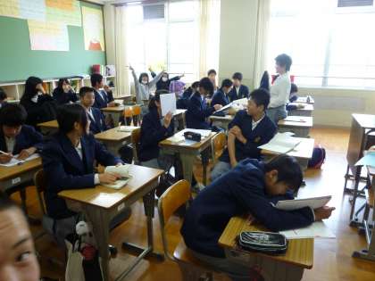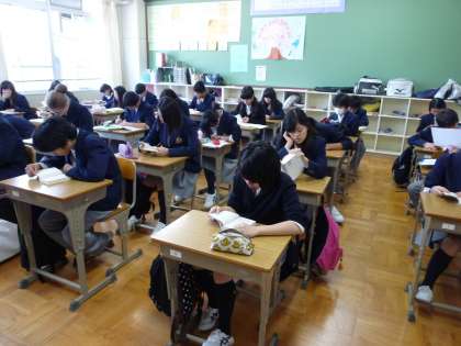 朝の学活前の様子です。6組は担任の先生を待っています。3年生は朝読書のはずですが・・・。