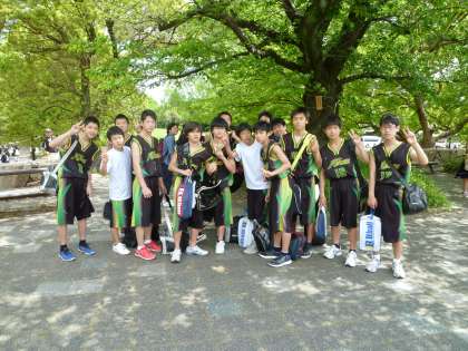 男子バスケットボール部はバスに乗らず,そのまま桂中学校で練習試合です。女子バレー部は,素早く集まって記念撮影。