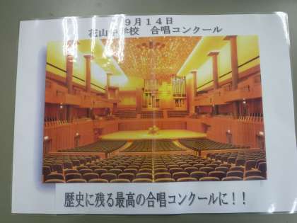 毎年,恒例となっています合唱コンクールの会場を昨年までは東部文化会館で行っていましたが,今年は北山の「京都コンサートホール」で開催することが決定しました。日時は9月14日(月)の午後からです。詳細は後日,報告します。今日の学活において,生徒会より放送を通じて発表があり,3年生の各教室では拍手とどよめきがおこりました。