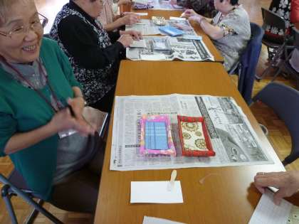 鏡山保育所の園児との交流や小物入れの制作,体操などで和やかな時間を過ごされていました。