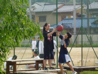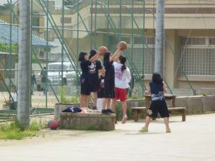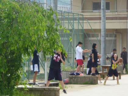 女子バスケットボール部が中庭でリバウンドの朝練習をしていました。