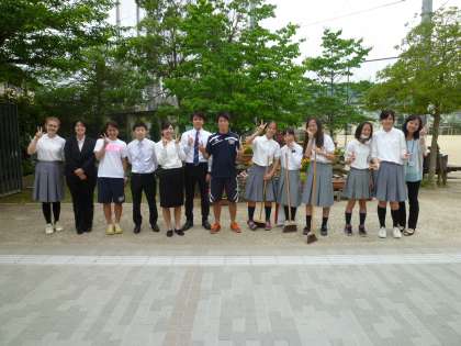 金曜日の朝の校門は生徒会のあいさつ運動です。教育実習生と吹奏楽部もまじえて活動です。