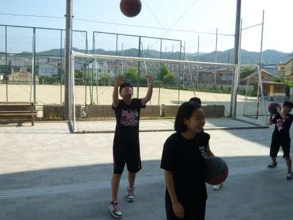 女子バスケットが校庭で朝練習です。