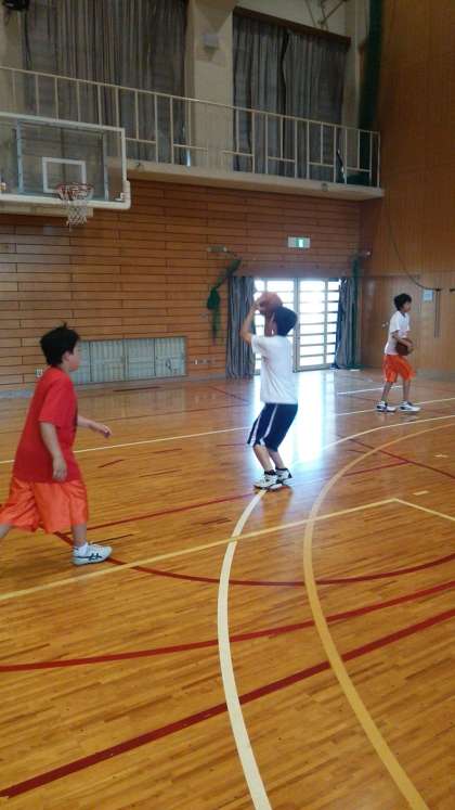 チームをいくつかに分けて,ドライブやゴール下のシュートなど効率的に練習しています。