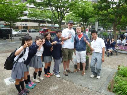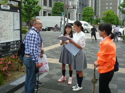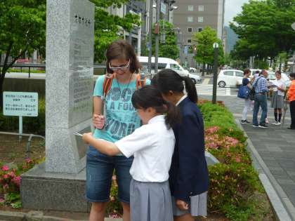 指示の外国人へのインタビューができていない班は市役所前でインタビューです