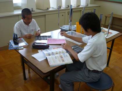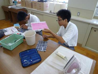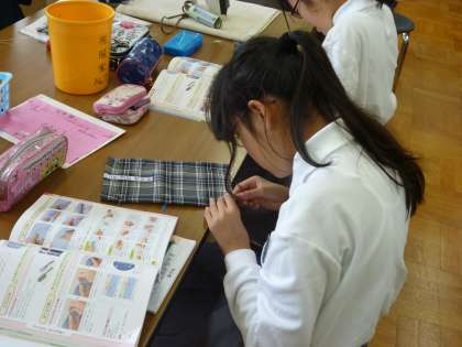 1年生が被服室でまつり縫いの練習をしていました