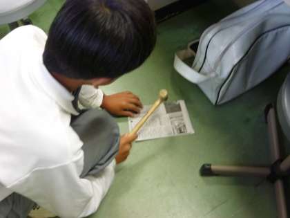 次に,うすい布地の上に葉を置き新聞紙でくるみます