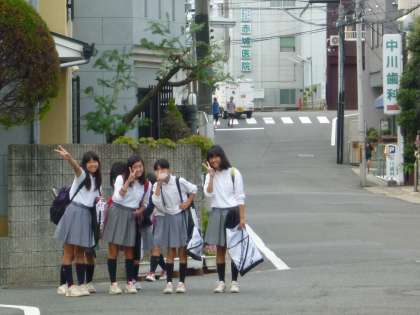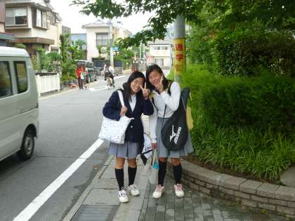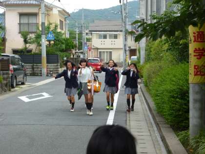朝の登校風景です。昨日までの雨もやみましたが梅雨らしい曇天です。