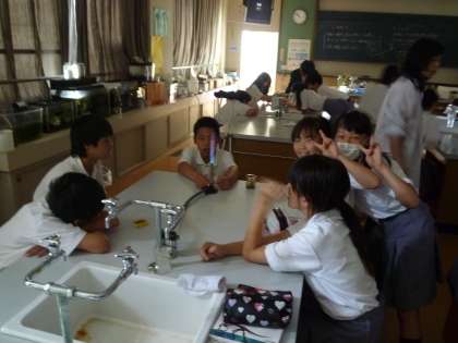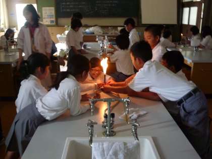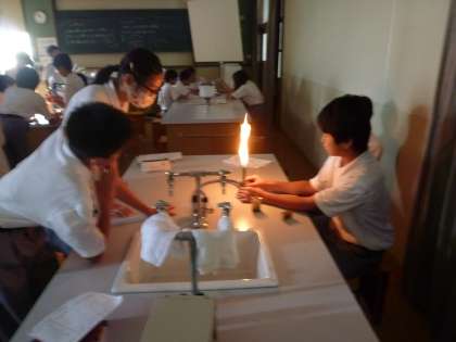 3限に理科室にて1年生がガスバーナーの使い方について実際に使って学んでいます