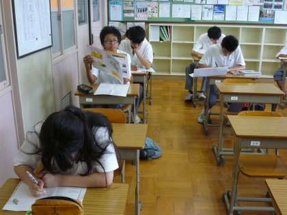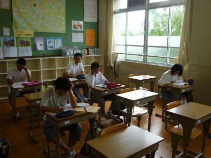 2つの教室で実施しています。約40名ほどが,自習教材を自分で用意して学習に取り組んでいます