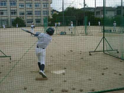 バッティングの際,木材の上に軸足をのせて打つ工夫もしています