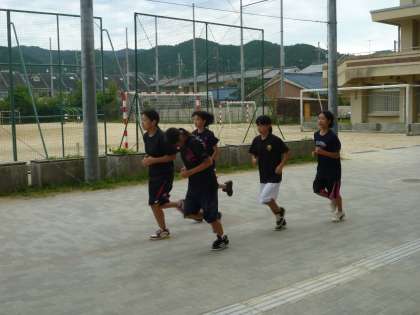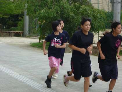 女子バスケットボール部が朝練習で校門付近をランニング中です