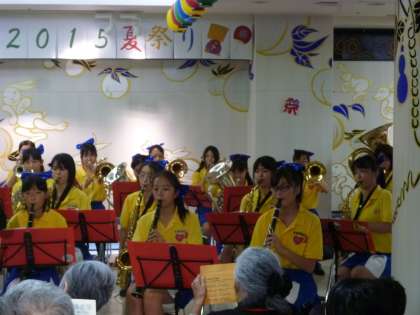 年配の方々を対象とした夏祭りですので,いつもの楽曲ではなく「故郷」「上を向いて歩こう」など年配の方にもおなじみの曲を選んでいました