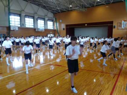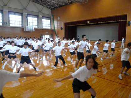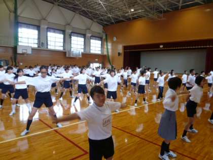 1年生が全員集まり,体育の部で披露するTakio’s ソーランを練習しています