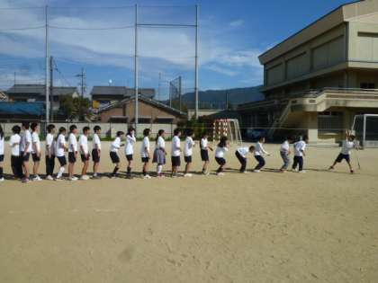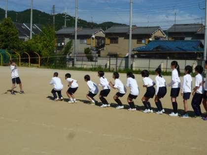 5限の学活を利用して1年生がグランドで大縄跳び大会を行いました