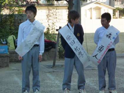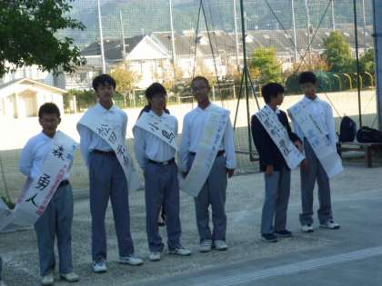 校門にて生徒会選挙活動が行われています