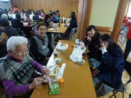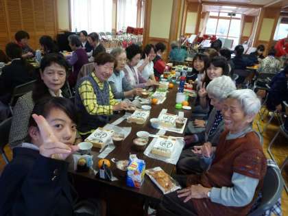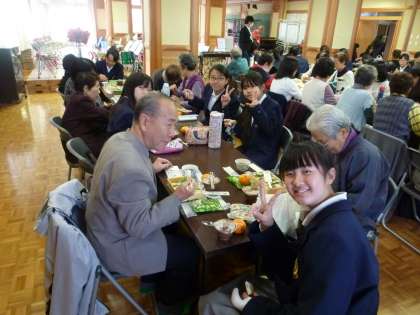 演奏のあと,参加されたご老人と昼食をいっしょにとり,交流を深めます