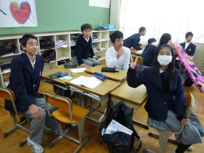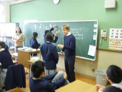 どうやら,英語の質問に答えて黒板の双六をしているようです